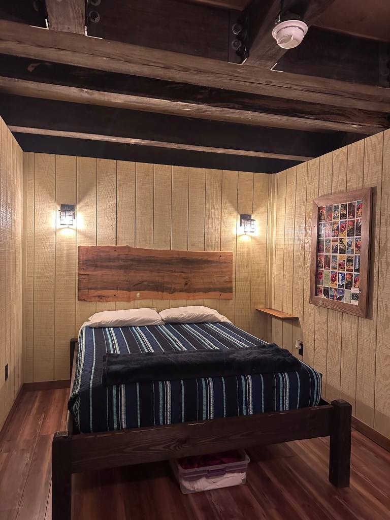This is the smaller of the two units and is fit with a full size bed, pull out couch, living area and bathroom. The perfect hobbit sized accommodations for just the two of us.