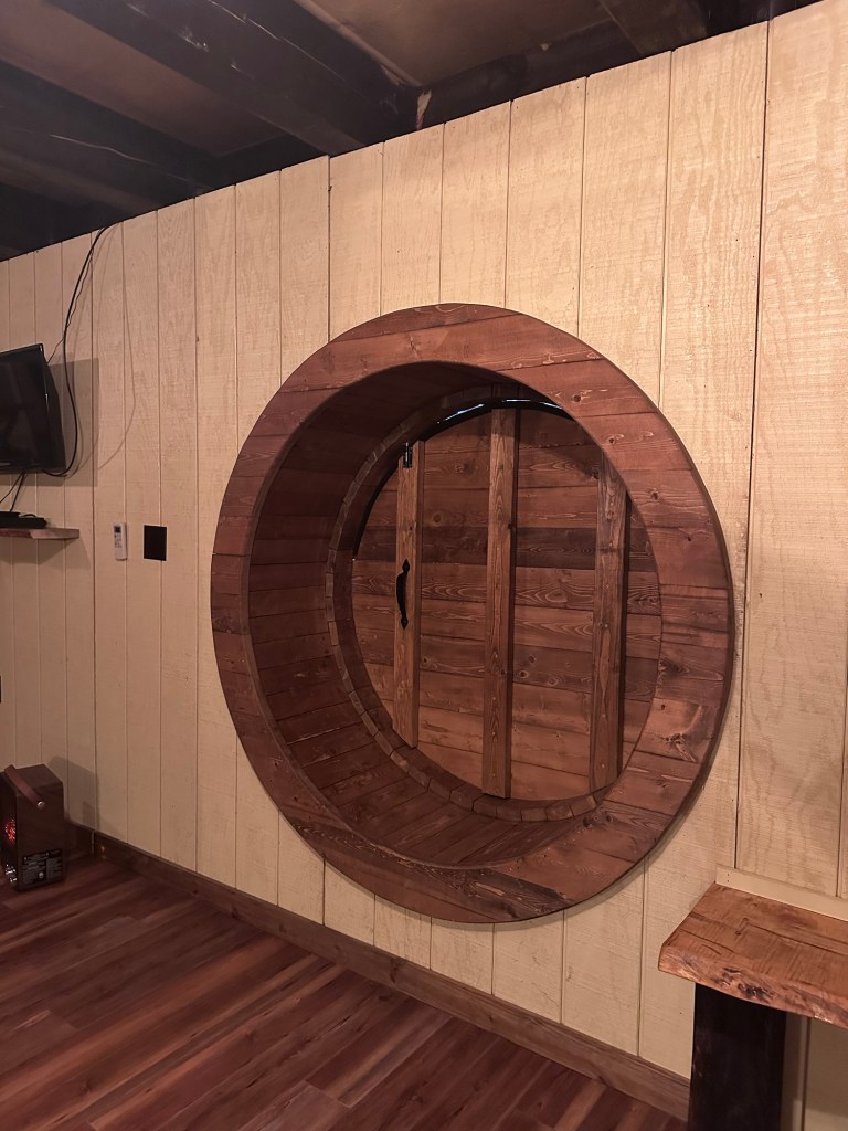 Immediately, J insisted on opening the round door and we were pleased to find it is indeed functional, although not ideal to keep going in and out of in the winter, lol. We got a few really great videos of donning our cloaks and walking sticks whilst exiting into the wooded path beyond the front door.