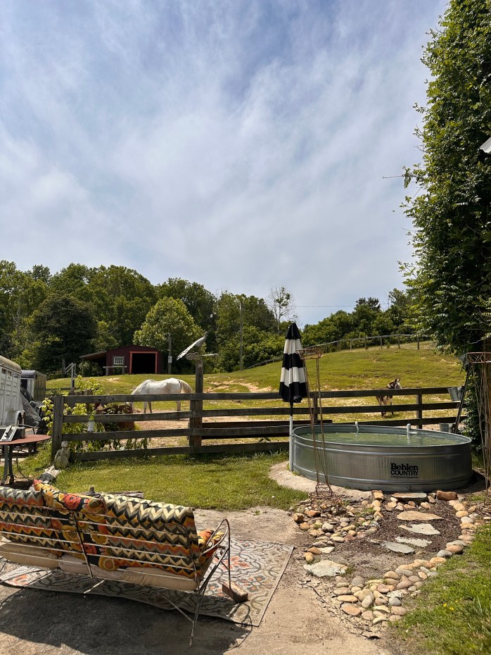 As if we weren’t already in love, just out the back door of the lower level of the barn, we found the unexpected surprise of a horse, a donkey and a feeding barrel turned to a pool!!