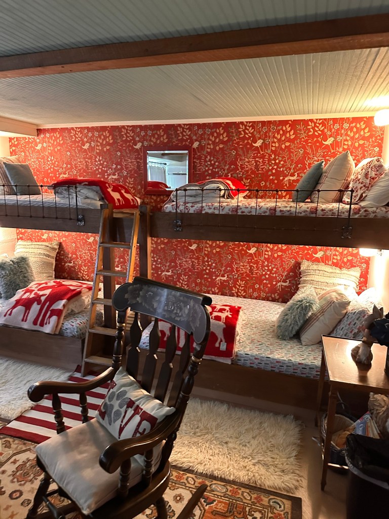 This old barn has been converted into three bedrooms, two of which look to me like house facades from the outside looking in. Each of those have a large bed and full bathroom. The third room, downstairs, has two sets of bunk beds and a bathroom!
